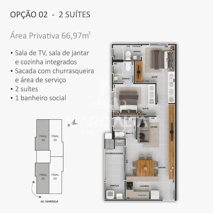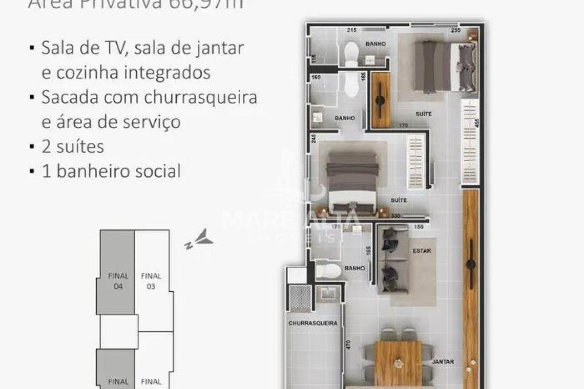 O apartamento, conta com 66,97 m² de área privativa, distribuídos de forma inteligente para garantir o melhor aproveitamento dos espaços. São 02 suítes, sala de estar e jantar integradas com a cozinha, criando um ambiente único, 01 banheiro social, área de serviço, sacada com churrasqueira e 1 vaga de garagem. Os ambientes são amplos, bem iluminados e ventilados, com acabamentos modernos e detalhes que trazem conforto e sofisticação ao dia a dia.
