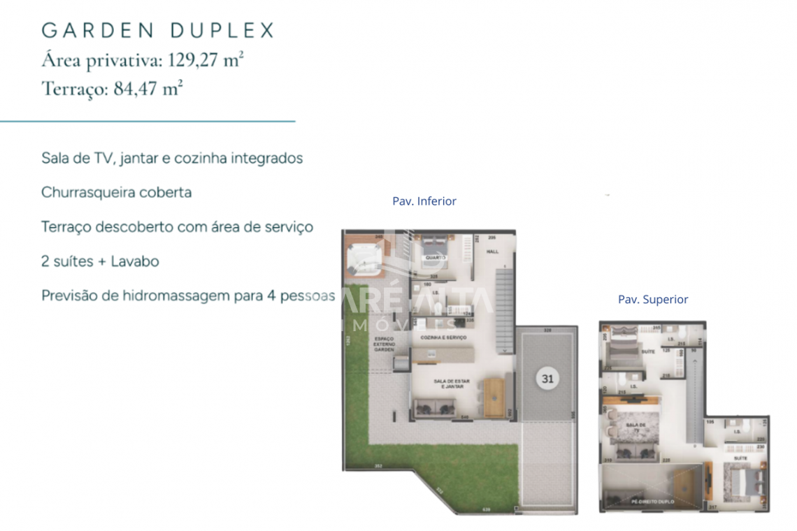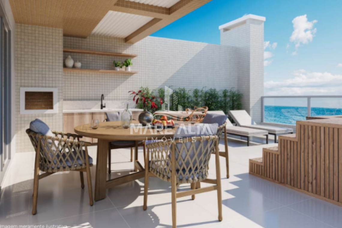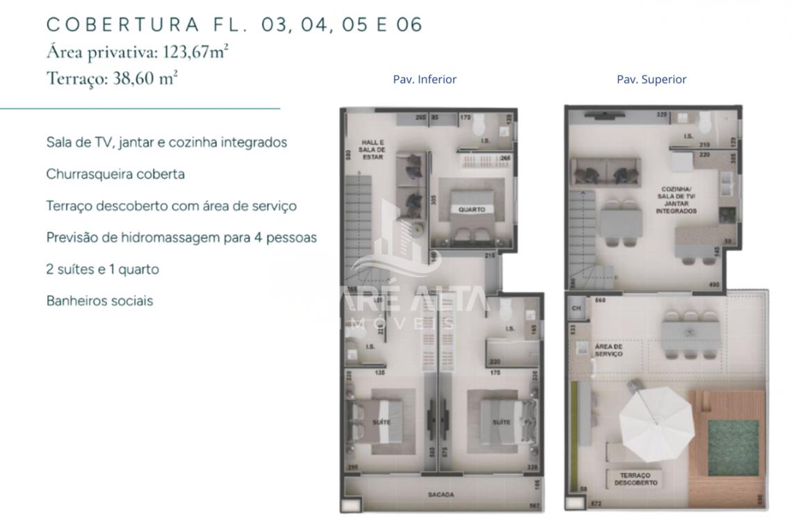 • Cobertura Duplex - Final 03, 04, 05 e 06 (frente): área privativa de 123,67m² -  terraço 38,60m², divididos em 03 dormitórios, sendo 02 suítes, ambas com sacada,, 01 banheiro social e hall de entrada, todos no piso inferior. No piso superior 01 banheiro social, sala de estar integrada com a sala de jantar e cozinha (espaço social), amplo terraço descoberto com área de serviço e churrasqueira e previsão de hidromassagem- Valor a partir de R$ 2.295.853,53