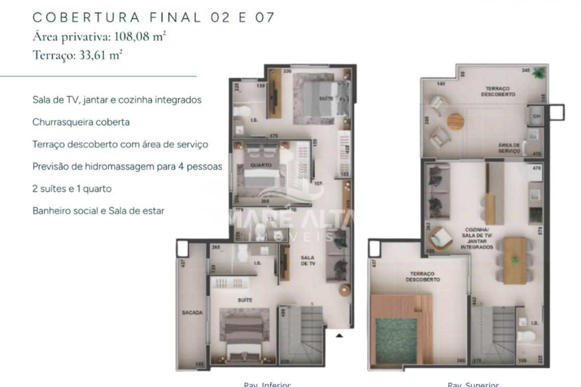 • Cobertura Duplex - Final 02 e 07 (lateral): área privativa de 108,08m² -  terraço 33,61m², divididos em 03 dormitórios, sendo 02 suítes, uma delas com sacada, 01 banheiro social e sala de TV, todos no piso inferior. No piso superior 01 banheiro social, sala de estar integrada com a sala de jantar e cozinha (espaço social), amplo terraço descoberto com área de serviço e churrasqueira e previsão de hidromassagem- Valor a partir de R$ 1.917.389,27