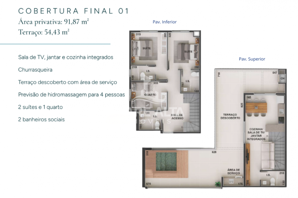 • Cobertura Duplex - Final 01 (fundo): área privativa de 91,87m² -  terraço 54,43m², divididos em 03 dormitórios, sendo 02 suítes, 01 banheiro social, todos no piso inferior. No piso superior 01 banheiro social, sala de estar integrada com a sala de jantar e cozinha (espaço social), amplo terraço com previsão de hidromassagem, área de serviço e churrasqueira - Valor R$ 1.753.176,17