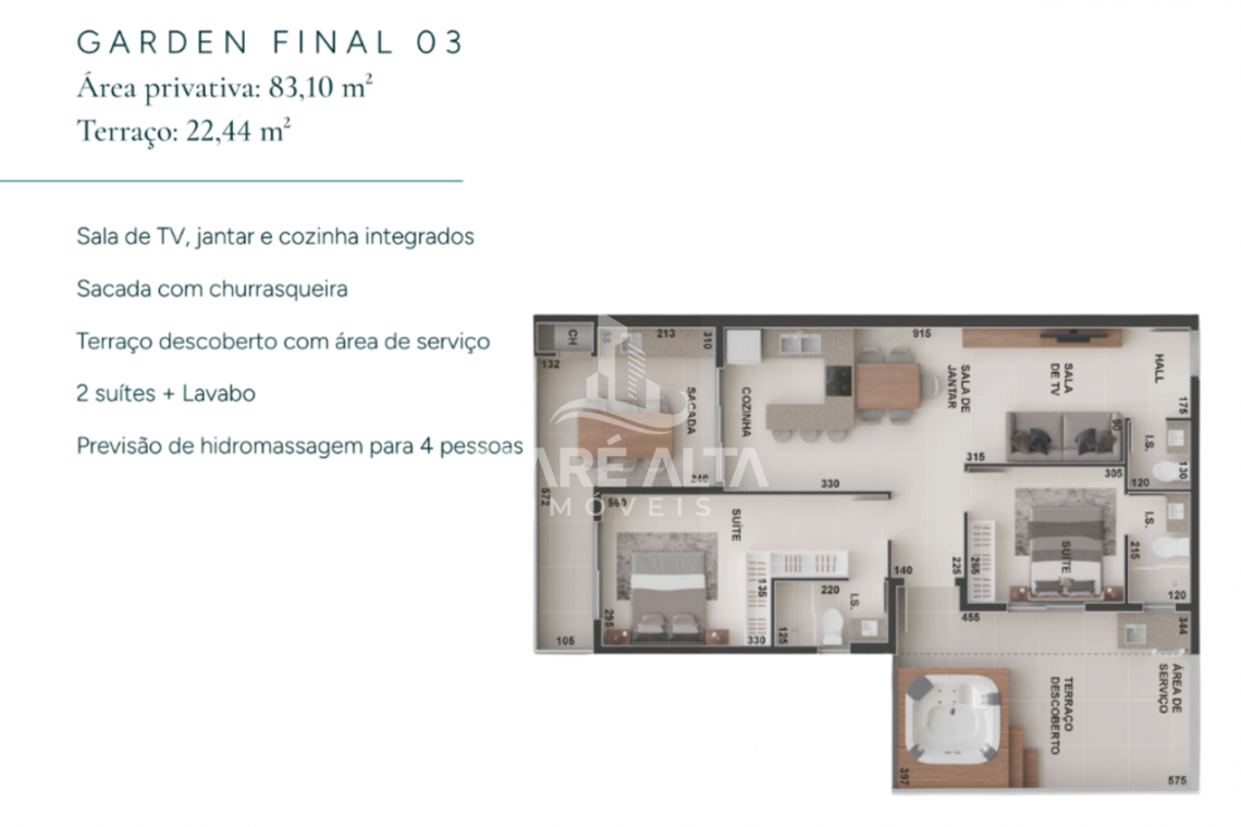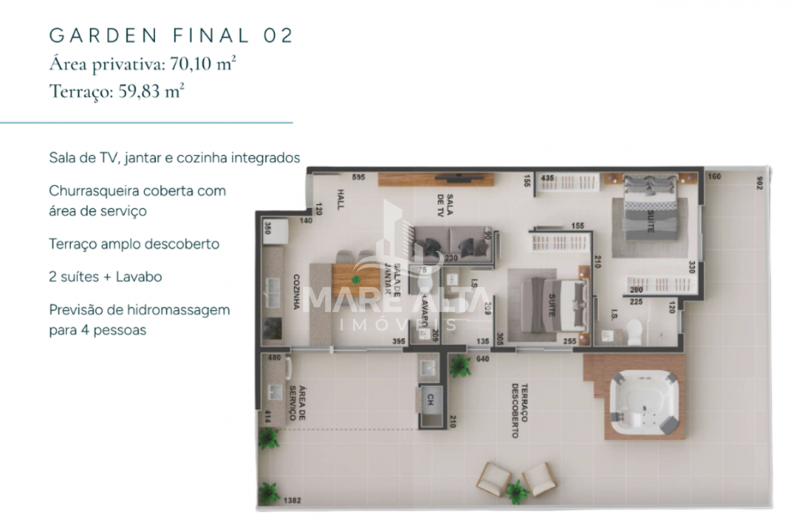 • Apartamento Garden - Final 02 (lateral): área privativa de 70,10m² -  terraço 59,83m², divididos em 02 suítes, 01 lavabo, amplo espaço de terraço descoberto com previsão de hidromassagem, área de serviço e churrasqueira coberta, sala de estar integrada com a sala de jantar e cozinha - Valor de R$ 1.259.123,56