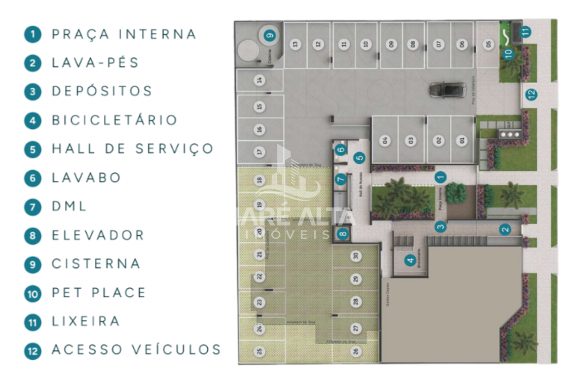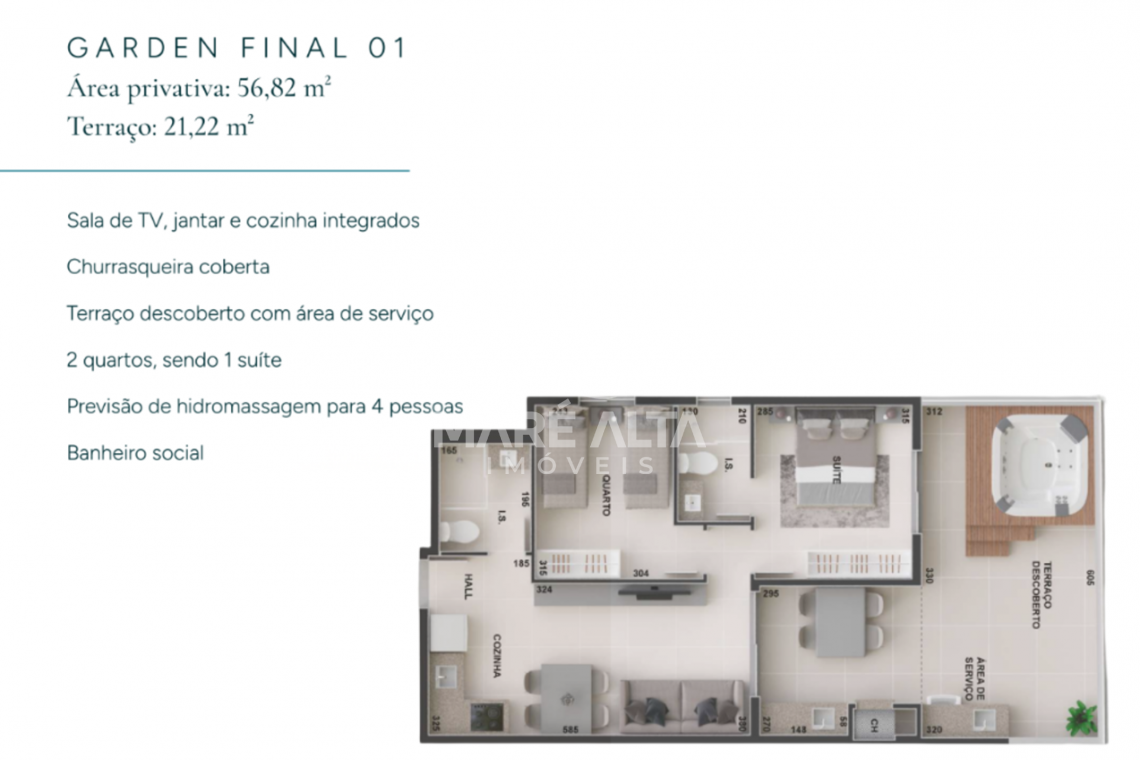 • Apartamento Garden - Final 01 (fundo): área privativa de 56,82m² -  terraço 21,22m², divididos em 02 quartos, sendo 01 suíte, 01 banheiro social, amplo espaço de terraço descoberto com área de serviço, com churrasqueira e previsão de hidromassagem, sala de estar integrada com a sala de jantar e cozinha - Valor de R$ 795.622,17