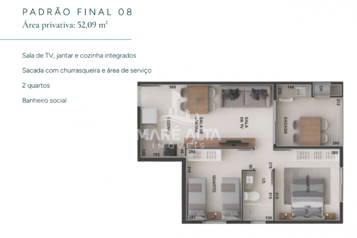 • Apartamento Tipo - Final 08 (fundo): área privativa de 52,09m², divididos em 02 quartos, 01 banheiro social, ampla sacada com churrasqueira e área de serviço, sala de estar integrada com a sala de jantar e cozinha - Valor a partir de R$ 676.629,79