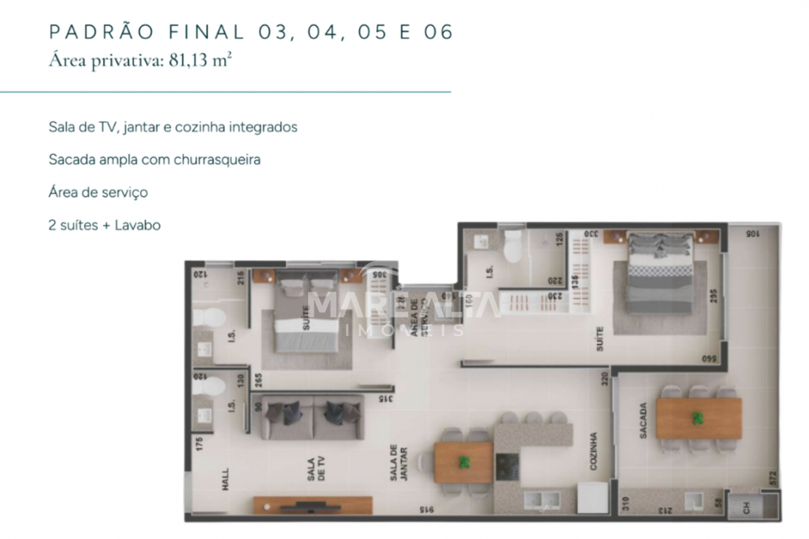 • Apartamento Tipo - Final 03, 04, 05 e 06 (frente): área privativa de 81,13m², divididos em 02 suítes, uma com acesso para sacada, 01 lavabo, ampla sacada com churrasqueira e área de serviço, sala de estar integrada com a sala de jantar e cozinha - Valor de R$ 1.362.298,15