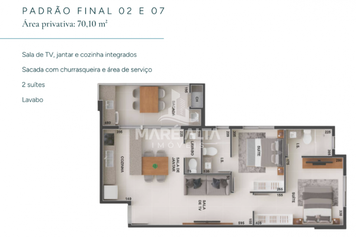 • Apartamento Tipo - Final 02 e 07 (lateral): área privativa de 70,10m², divididos em 02 suítes, 01 lavabo, ampla sacada com churrasqueira e área de serviço, sala de estar integrada com a sala de jantar e cozinha - Valor de R$ 957.070,36