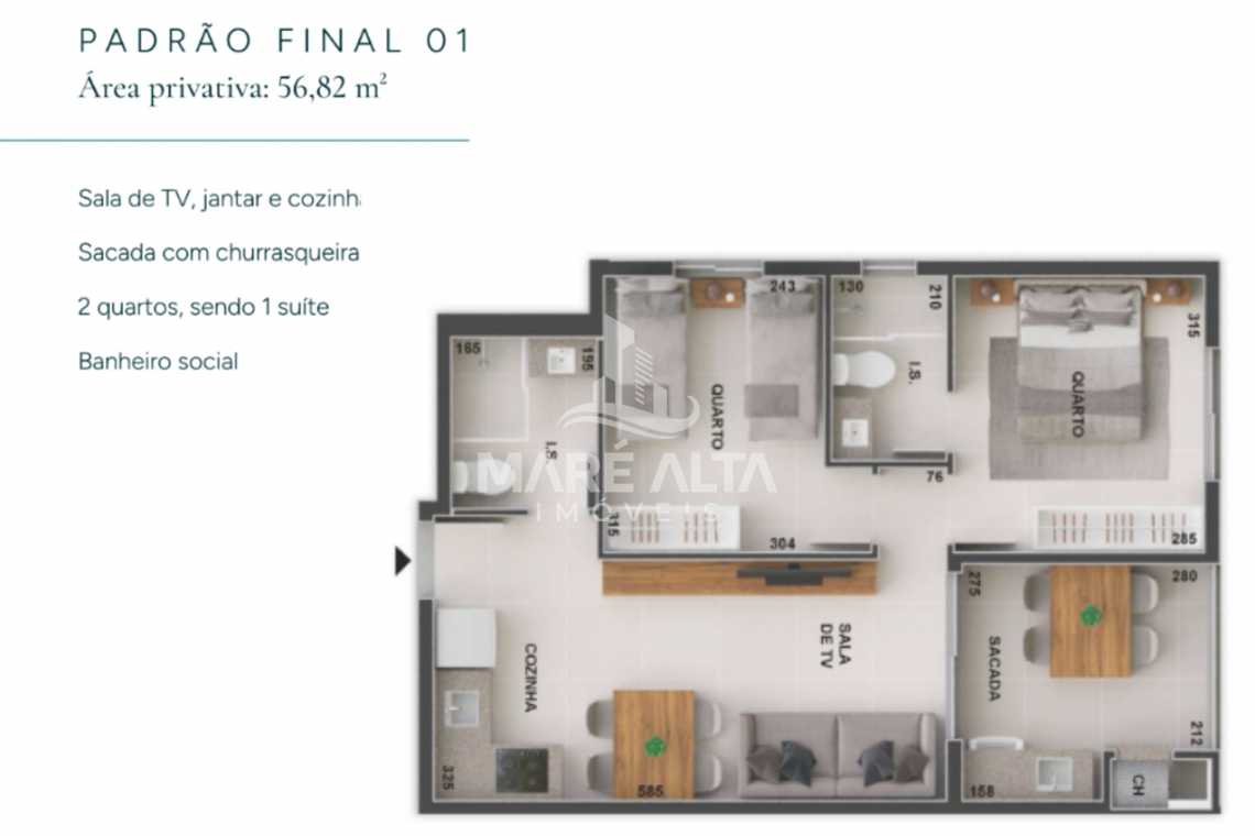 • Apartamento Tipo - Final 01 (fundo): área privativa de 56,82m², divididos em 02 dormitórios, sendo 01 suíte, ampla sacada com churrasqueira e área de serviço, 01 banheiro social, sala de estar integrada com a sala de jantar e cozinha - Valor de R$ 708.626,42