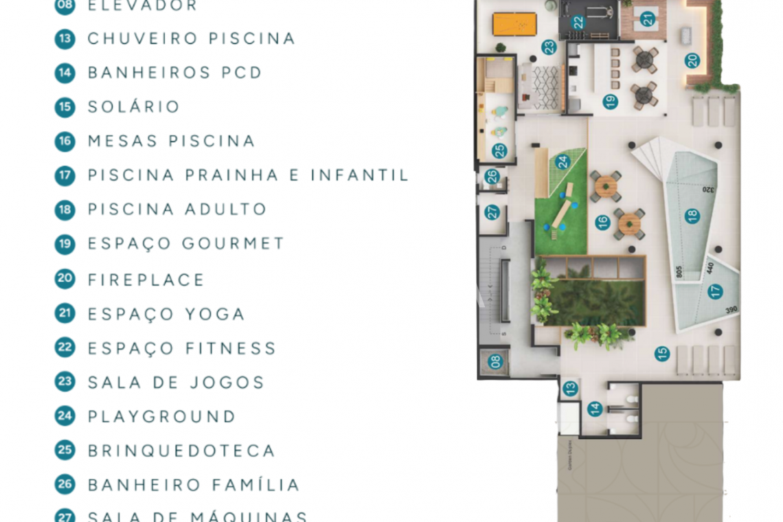 O edifício ainda possui os seguintes diferenciais, como elevador, chuveiros piscina, solário, Piscina adulto e infantil com aquecimento, espaço gourmet, fireplace, espaço yoga, espaço fitness, sala de jogos, playground, brinquedoteca, portões automatizados, monitoramento por câmeras, medidores de água e gás individualizados, hall de entrada, praça interna, pet place e bicicletário.Churrasqueira em todos os apartamentos, infraestrutura para ar-condicionado split em todos os quartos, fechaduras eletrônicas e preparado para aquecedor a gás.
