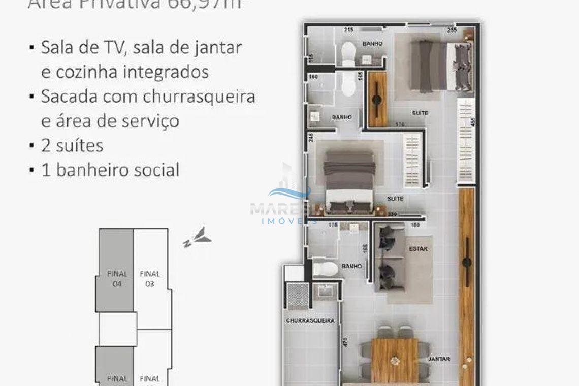 O apartamento, conta com 66,97 m² de área privativa, distribuídos de forma inteligente para garantir o melhor aproveitamento dos espaços. São 02 suítes, sala de estar e jantar integradas com a cozinha, criando um ambiente único, 01 banheiro social, área de serviço, sacada com churrasqueira e 1 vaga de garagem. Os ambientes são amplos, bem iluminados e ventilados, com acabamentos modernos e detalhes que trazem conforto e sofisticação ao dia a dia.