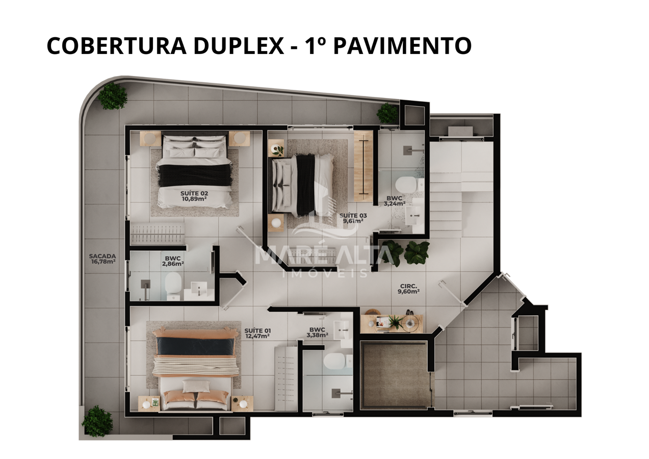 Cobertura duplex com 177,53 m ² de área privativa e 280,81 m² de área total distribuído em: