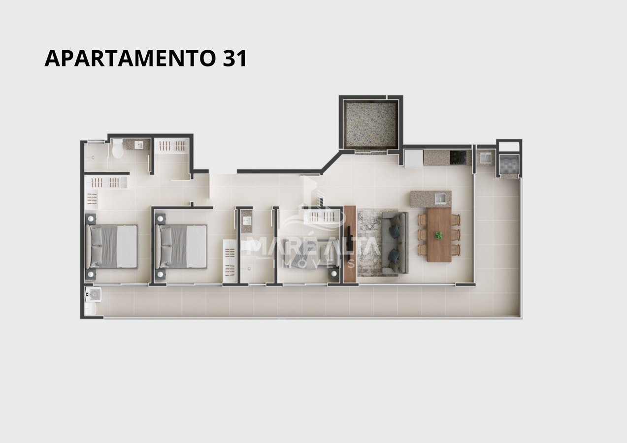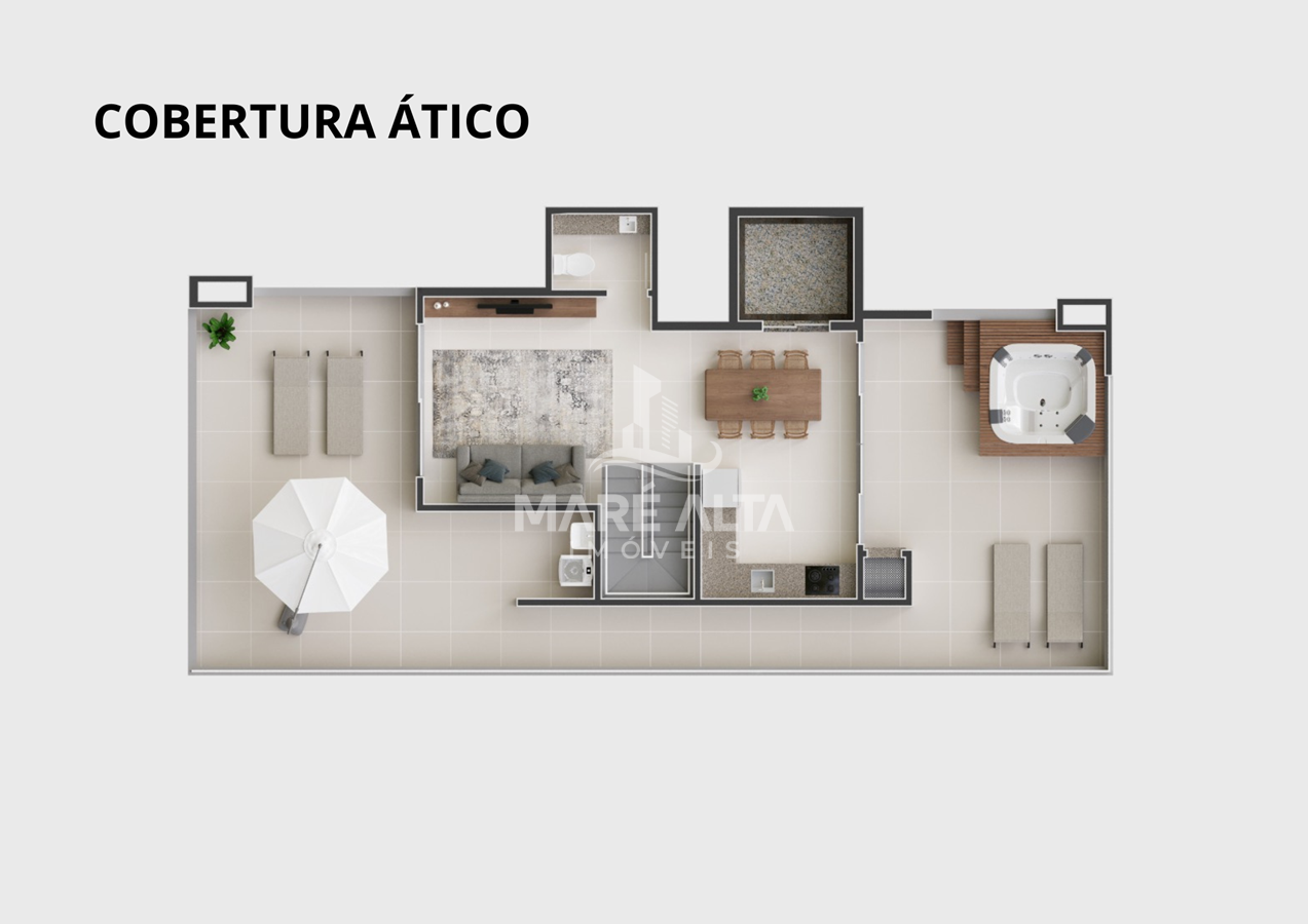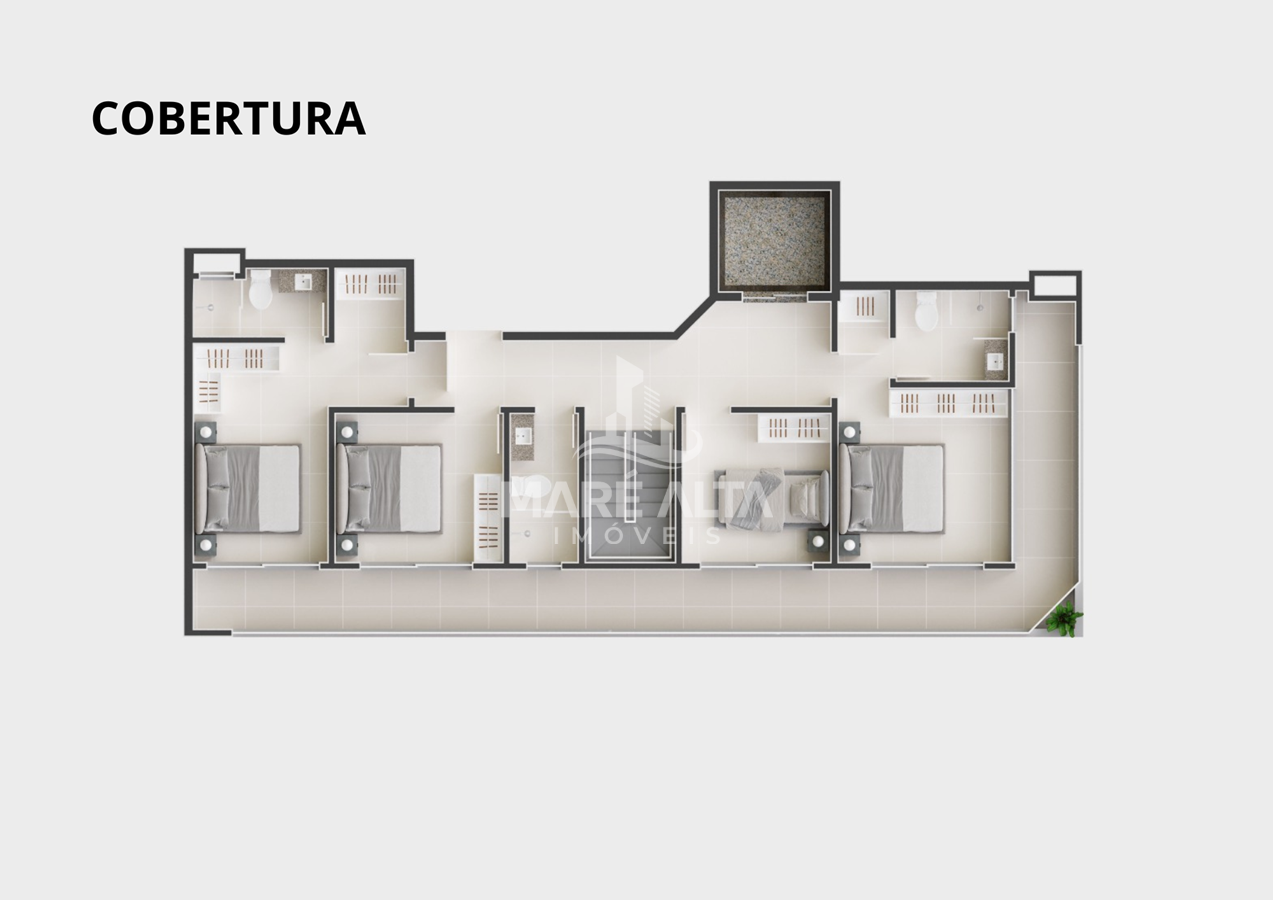 - Cobertura Duplex (41): área total privativa de 205,22 m², divididos em 04 dormitórios, sendo 02 suítes, 01 banheiro social, 01 lavabo, sala de estar integrada com a sala de jantar e cozinha (espaço social), ampla cobertura com espaço para SPA privativo e outros equipamentos de lazer, área de serviço e 03 vagas de garagem - Valor R$ 2.900.000,00