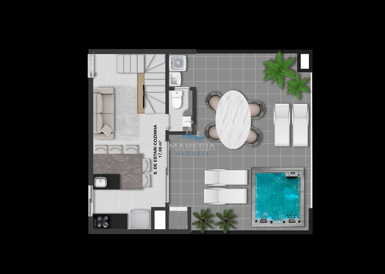 - Cobertura Duplex - 31, 33 e 34: área privativa de 118m² e total de 145m², divididos em 03 dormitórios, sendo 01 suíte, 01 banheiro social, todos no piso inferior. No piso superior 01 lavabo, sala de estar integrada com a sala de jantar e cozinha (espaço social), amplo terraço com churrasqueira e área de serviço - Valor a partir de R$ 949.000,00
